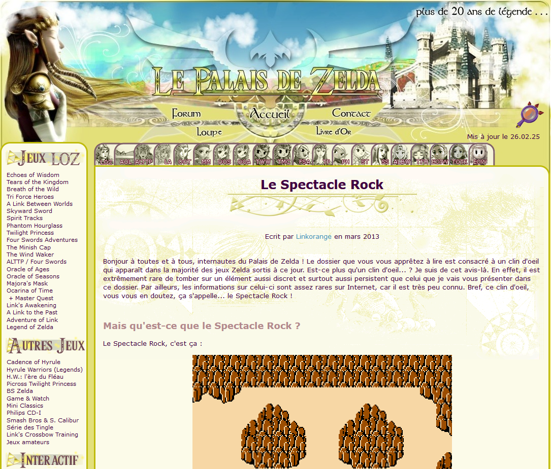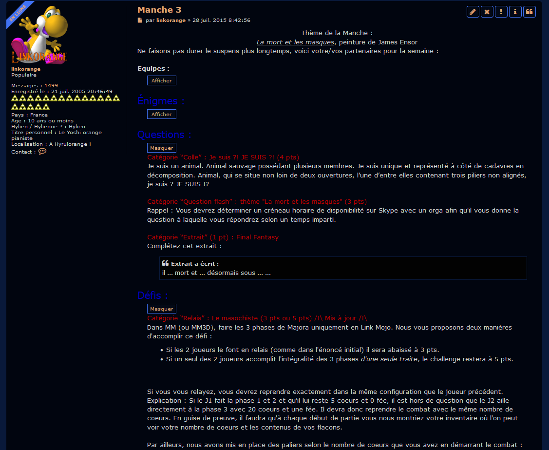 Là où j'ai été le plus actif, c'est sans conteste le forum du site Le Palais de Zelda, qui a pendant longtemps été LA référence francophone sur la série éponyme. Je m'y suis inscrit en juillet 2005 et on a partagé plein de trucs sympa avec les membres qui se sont succédés pendant plus d'une dizaine d'années : débats enflammés sur la chronologie (et je peux vous garantir qu'avant que Skyward Sword ne sorte, c'était sacrément enflammé 😄), rencontres IRL à la Japan Expo, jeux estivaux pendant nos vacances d'été...