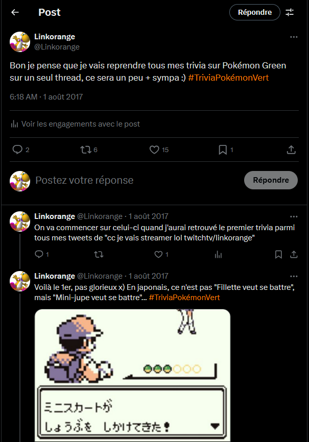 Un autre trait qui me caractérise est que je réside au Japon (ce qui rend plutôt tendu ma participation à des événements en France 😭), et je parle couramment japonais. Et un truc qui m'a toujours beaucoup intéressé, c'est la version originale des jeux auxquels je joue. C'est pourquoi je suis plein d'anecdotes sur la version japonaise de bon nombre de jeux / séries, et j'en partage de temps à autres, que ce soit en stream ou via Youtube, mais mon principal canal de partage d'anecdotes, ce sont mes Linkothreads sur Twitter / Bluesky.