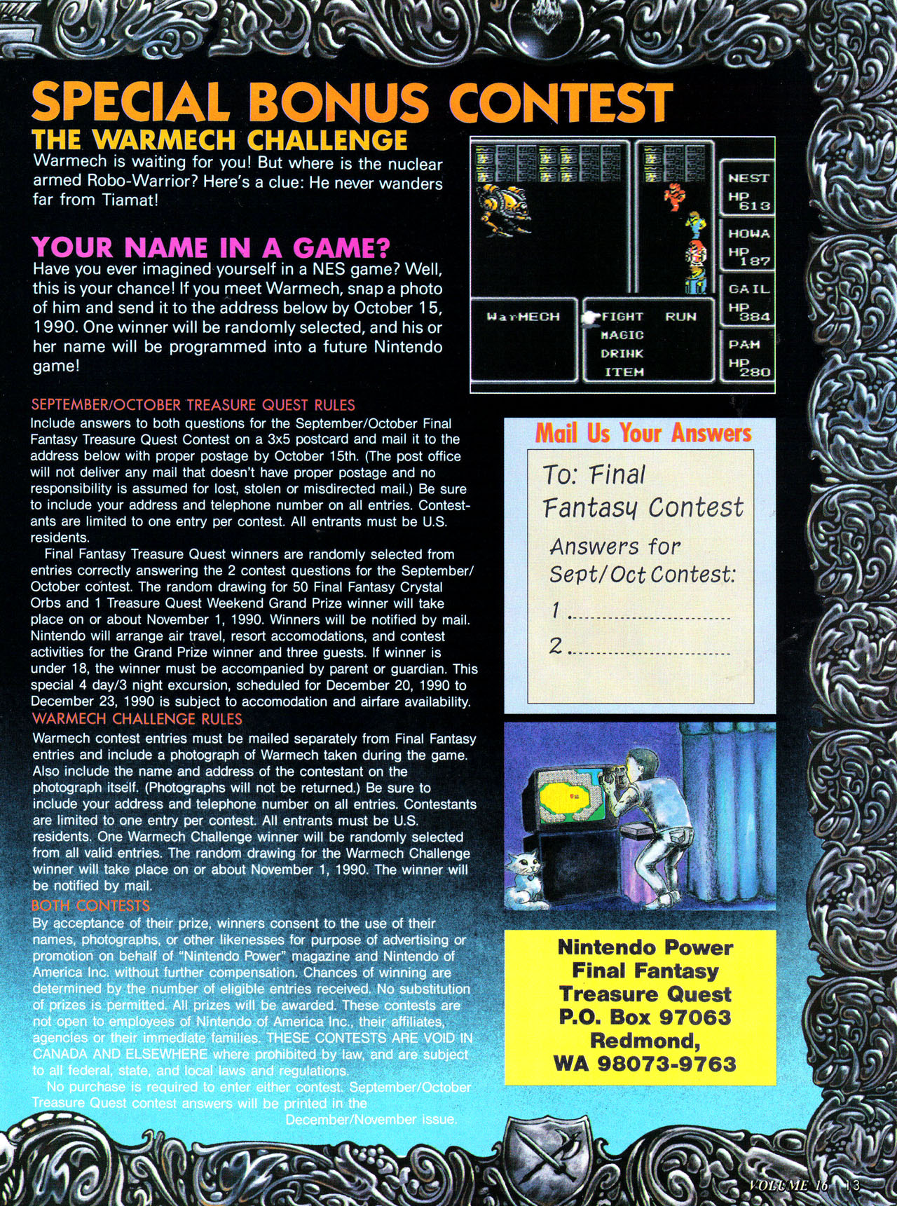 On voit également dans les règles du concours que les résultats de ce dernier seront envoyées par courrier au vainqueur. Ils n'ont par conséquent jamais été rendus publics contrairement à ce que l'on pourrait penser, et il n'y a donc absolument rien pour relier ce concours, et le nom de Chris Houlihan qui apparaît dans A Link to the Past. Mais d'un autre côté, ça n'invalide pas entièrement la rumeur, et il est également tout à fait possible que les événements se soient déroulés dans les faits exactement tels qu'ils sont racontés. Il faut juste rester conscient qu'aujourd'hui personne n'en sait strictement rien.