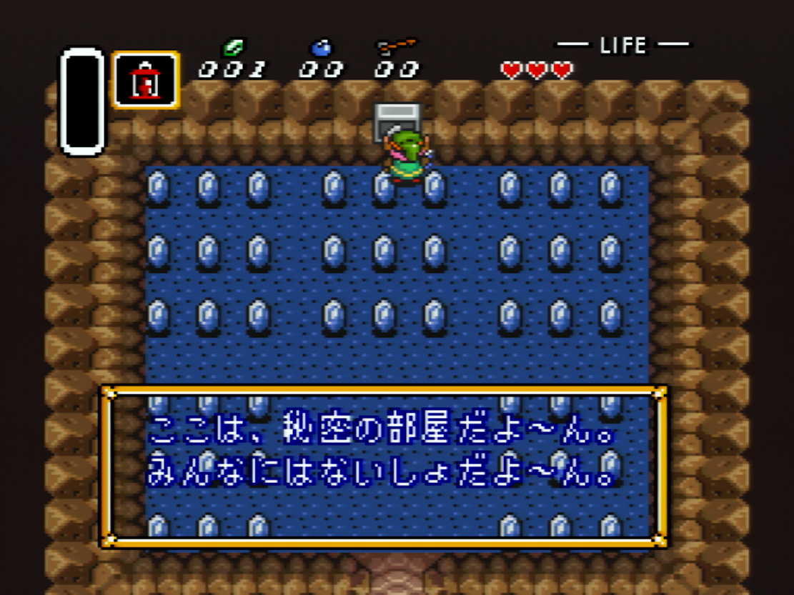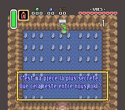 * Quand je dis "relativement", c'est parce que la plaque télépathique ne précise pas que c'est "sa" salle en japonais. On n'a donc aucune information sur le personnage qui parle à travers cette plaque : ça pourrait être Sahasrahla, ça pourrait être un narrateur extérieur au jeu, ça pourrait aussi être... un Moblin ?!?