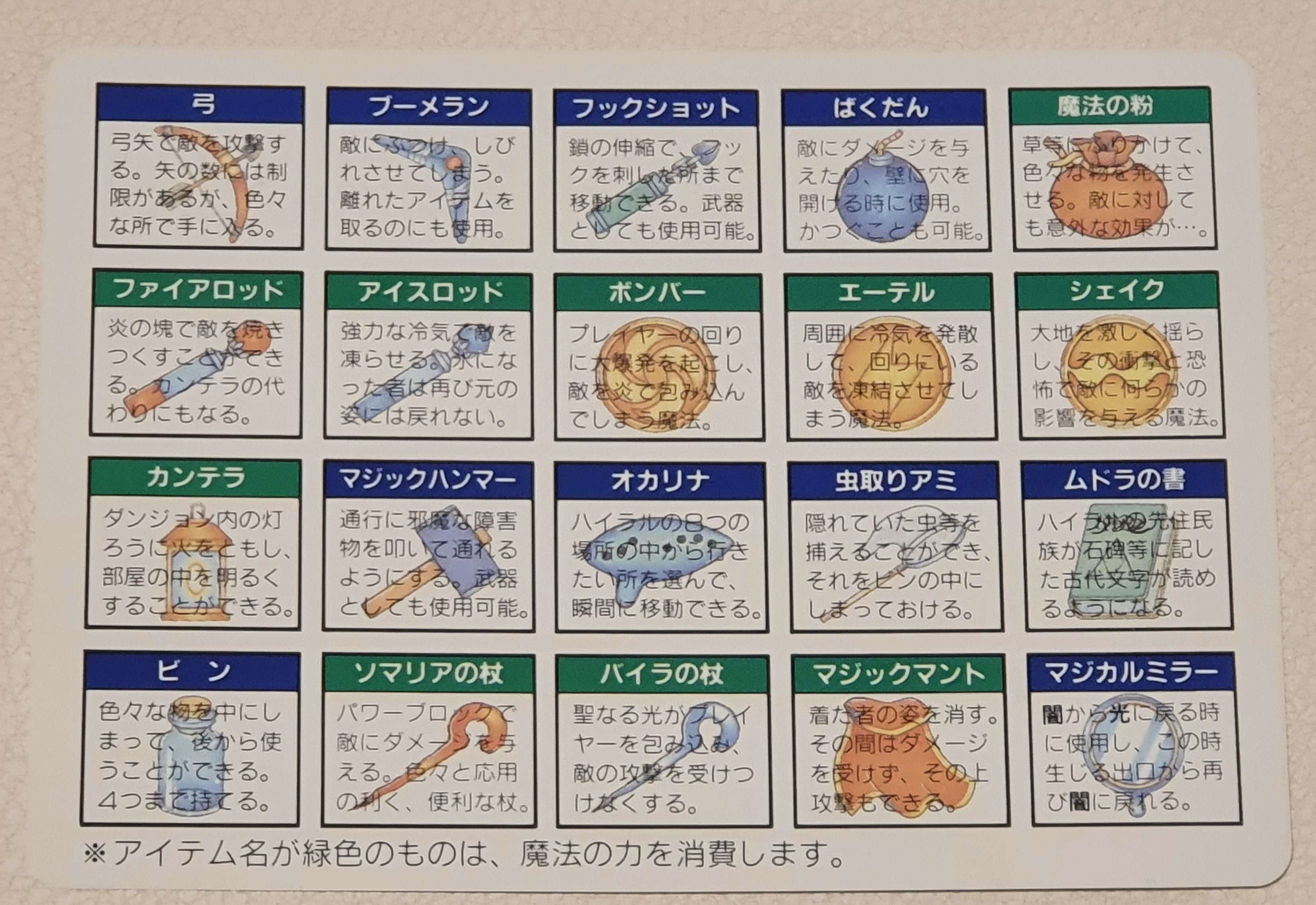 La base de données ci-dessous est divisée en différentes catégories : l'inventaire, qui liste principalement les objets que Link peut utiliser grâce au bouton Y ; puis l'équipement, qui sont les objets passifs qui ont une influence sur le gameplay. Enfin on finit avec une liste d'inclassables (que j'ai quand même classés 😁).