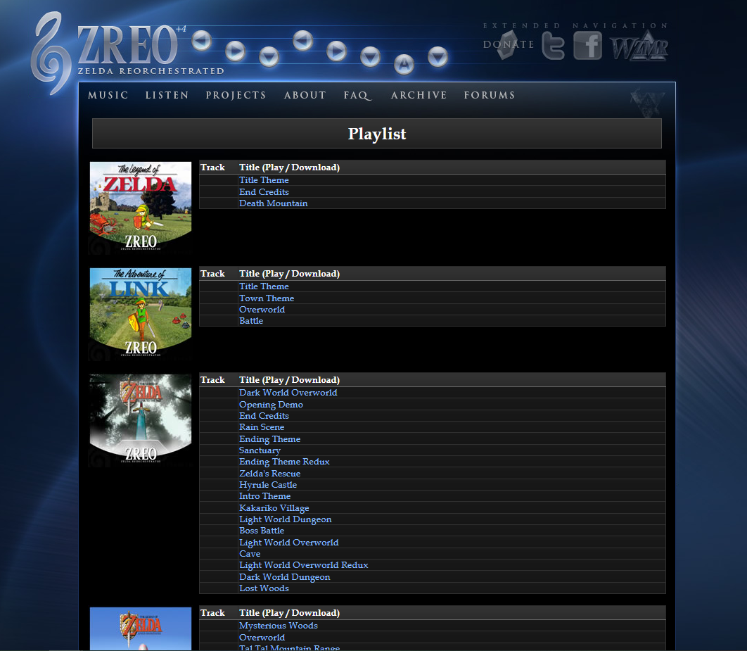Pourquoi je parle au passé ? En 2013, ils avaient décidé de fermer leur site et malheureusement, tout le contenu musical qui s'y trouvait n'est aujourd'hui plus disponible (même si le site d'époque est encore accessible, merci Wayback Machine !). Cela dit, par chance, j'avais téléchargé les musiques de Zelda 3 et elles sont sur mon PC, par conséquent quand j'aurai la motiv' je les uploaderai et je les rendrai accessibles par ici 🙂. Leur dernier projet avant la fermeture de leur site, a été de réorchestrer l'entièreté de l'OST de Twilight Princess, dans un album intitulé "The Twilight Symphony".