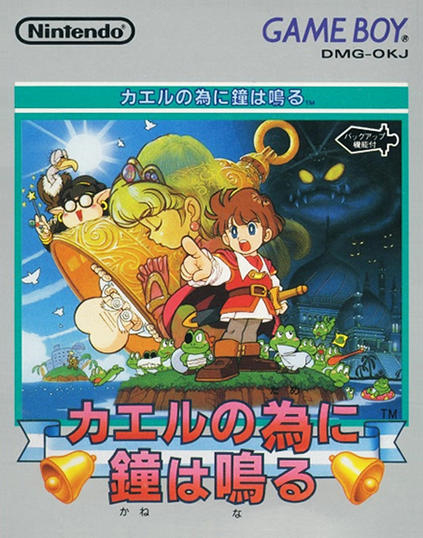 Kaeru no tame ni kane wa naru, de son nom japonais カエルの為に鐘は鳴る, est un jeu Gameboy édité et développé par Nintendo sorti en 1992 exclusivement au Japon. Le titre n'est peut-être pas très parlant sous cette forme, et on trouve souvent la traduction anglaise non officielle "The frog for whom the bell tolls". Pour ma part je trouve cette traduction un poil erronée, et c'est pourquoi j'en ai fait la proposition suivante (en français) : Les grenouilles pour qui sonnent le glas.